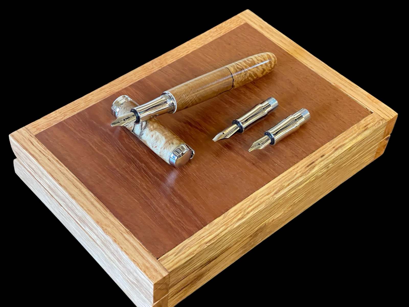 This exceptional set is housed in a handcrafted Oak and Mahogany wooden presentation box, elevating it as a perfect gift for calligraphers, artists, writers — or anyone who values the blend of natural beauty and skilled craftsmanship.
