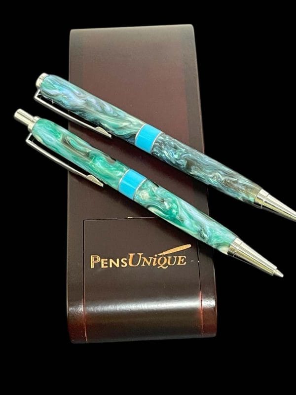 This stunning pen and pencil set have been carefully crafted from Teal Abalone resin. The iridescent shimmering of the blues and greens makes for a mesmerising pattern and is sure to make it stand out from the crowd.